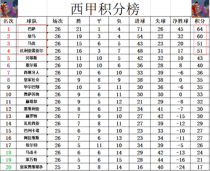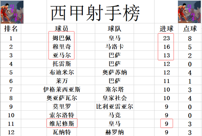 射手榜方面,伤缺的姆巴佩还是23球领跑,穆里奇16球排在第2,亚马尔13球第3,托雷斯,布迪米尔12球并列第4。维尼修斯今天错失超级单刀,还是和莫里罗,索尔洛特,瓦纳特9球刚好挤入前十。